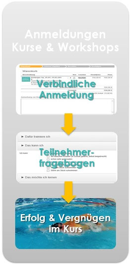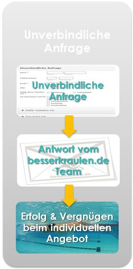 Damit wir jeden Interessierten zufrieden stellen können, gibt es eine direkte Quick-Bestellvariante unter "Anmeldung Kurse & Workshops", aber auch eine "unverbindliche Anfrage", über die individuelle Anfragen zu unserem Angebotsportfolio gestellt werden können. Diese können nur für einen selbst sein, aber auch für Kleingruppen, von einmaliger Betreuung bishin zu einer Jahresbetreuung. Bei Fragen zum Anmeldeprozess oder Unklarheiten stehen wir gerne unter info@besserkraulen.de zur Verfügung.